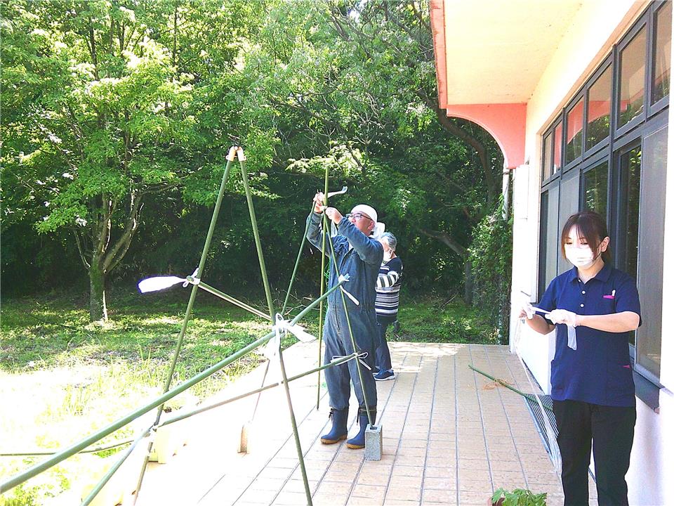 ゴーヤカーテンを作るために心強い助け人現る!!!!! 池澤センター長が支柱の組み立てをしてくれました!