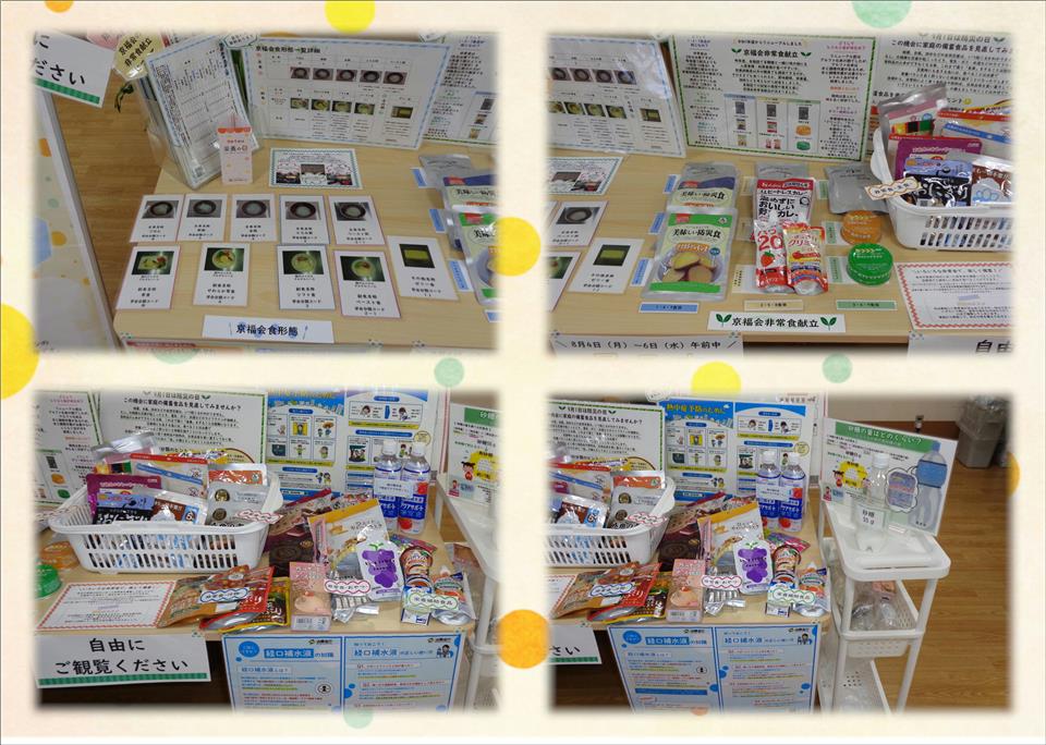 今年は【京福会食形態について】【京福会非常食について】 【9月1日は防災の日について】【熱中症対策について】の展示コーナーを作りました。 今回、栄養補助食品・水分補給商品を株式会社明治様、非常食を株式会社明治フード様に ご協力頂きました。 この場をお借りして御礼申し上げます。