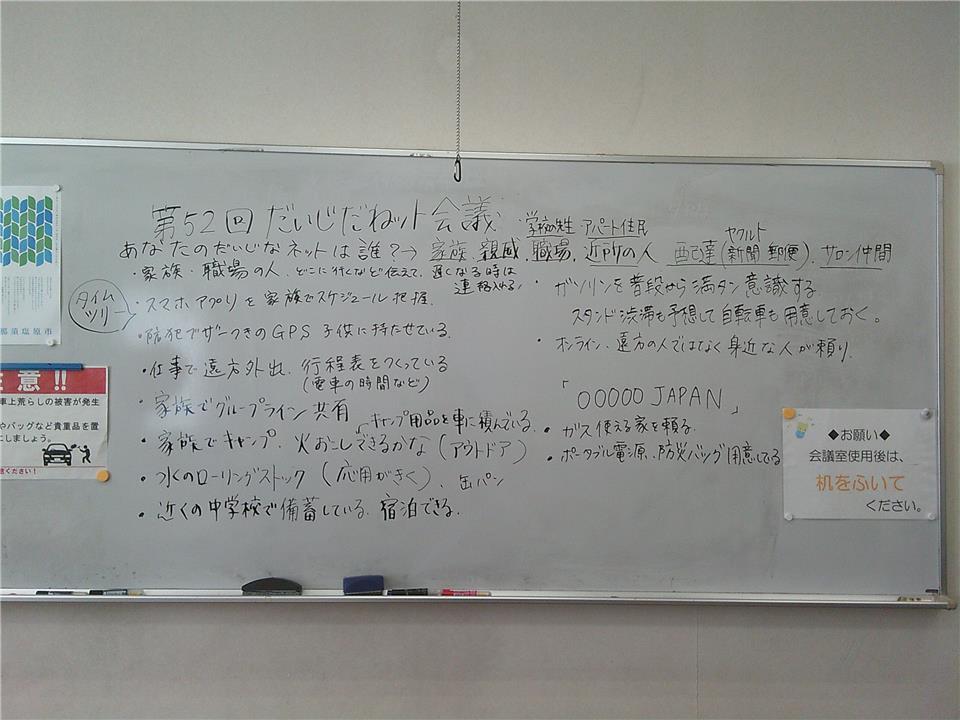 新聞配達員や生協のスタッフが地域の見守り役として機能しているという話もあり、支え合いは特別なことではなく、日常の延長線上にあるのだと感じられました。 会議の後半では、実際に役立つ備えの知恵も共有されました。