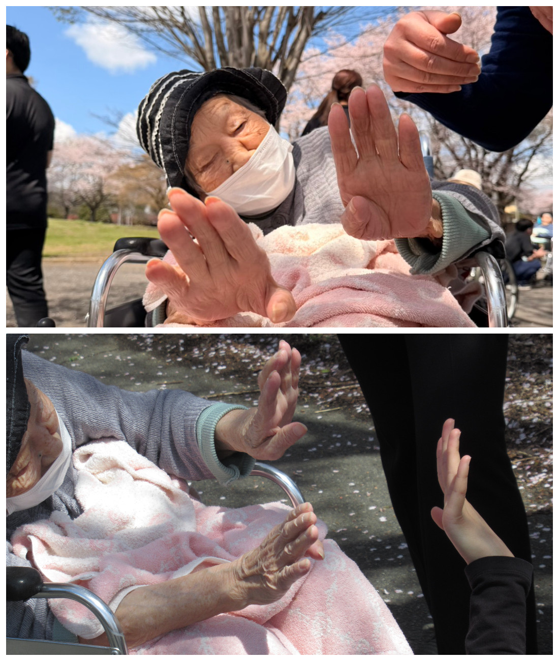 「私はね、日本舞踊を習っていてね。この時期には発表会があって練習が大変だったの。だからね、桜を見るとついつい踊りたくなっちゃうのよ。」見様見まねで職員も踊ります。