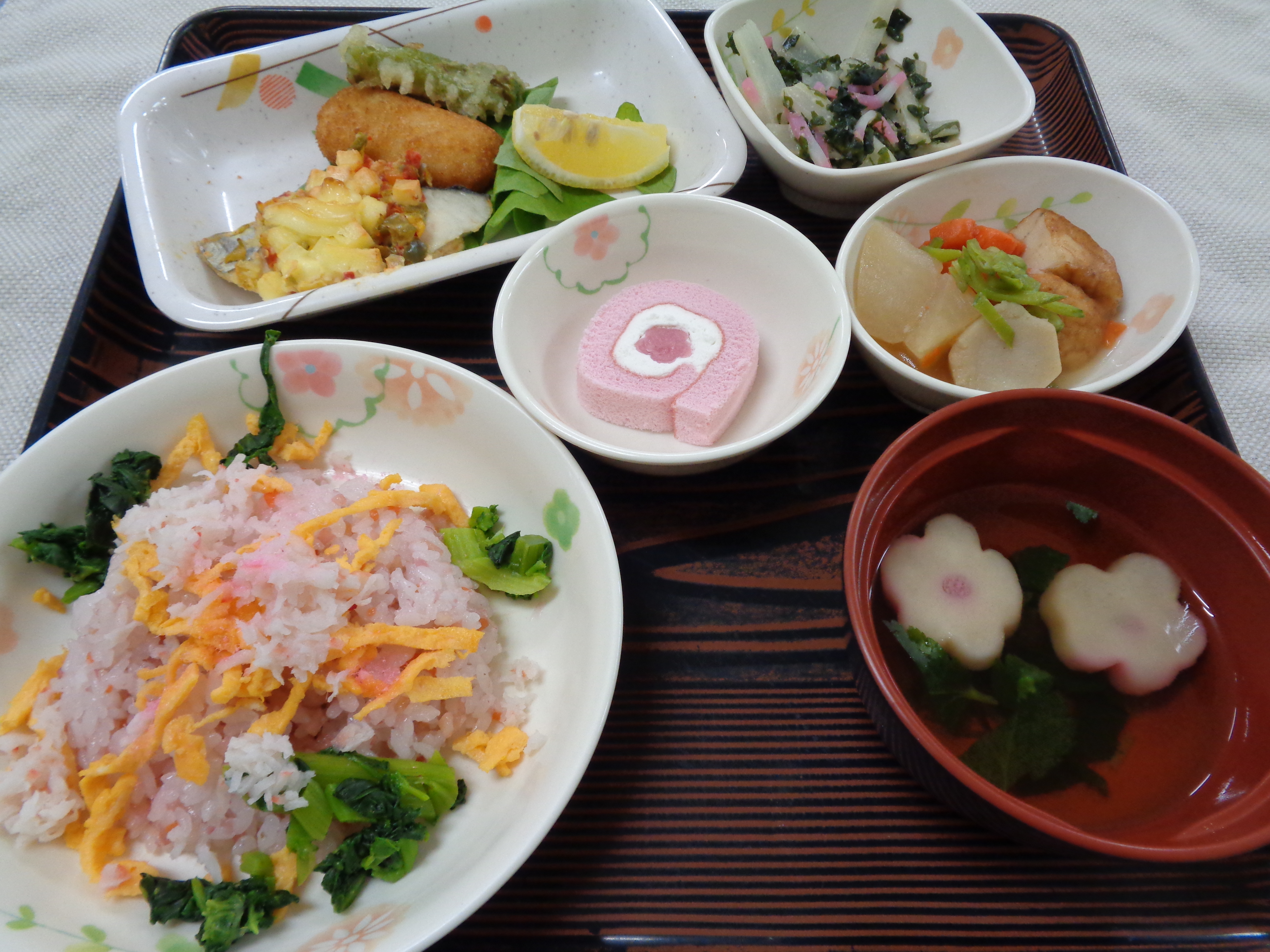 利用者様に提供した昼食です。 鰆やうど、菜の花など旬の食材を使用しています。 ちらし寿司も桜色です。 真ん中が桜の形🌸になっているロールケーキ可愛いですね。桜の形になっているところは桜の味がするんです。