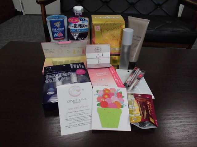 コスメバンクプロジェクトとは、その名のとおり化粧品類を集めて必要な人のところへ届ける活動になります♪ 化粧品類については、現行品から旧仕様の物、返品された未使用品などが、この活動に賛同したメーカー等から集められたそうです。 早速寿山荘でも申し込みを行ったところ、これらの物が届きました。 もちろん費用はかかりませんでした♪