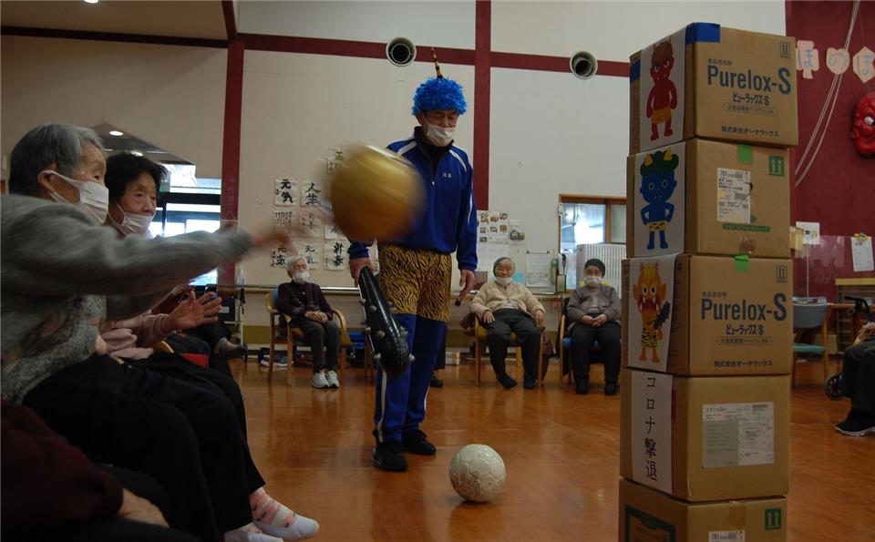 鬼に見立てた段ボールにサッカーボールを投げて倒す、 鬼退治ゲームです。 「簡単には倒されないぞ!」