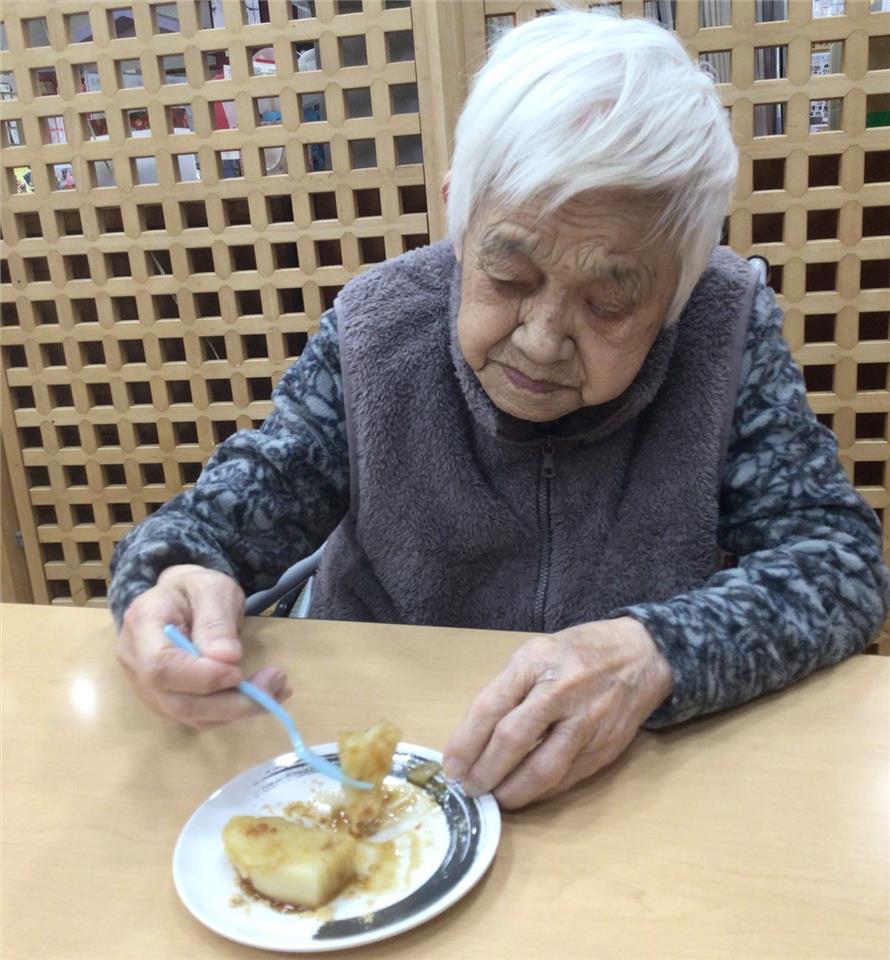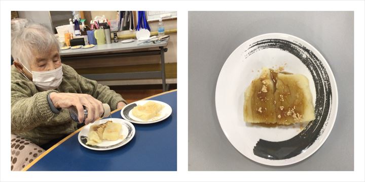 皆さんの伸びやかな歌声で場も盛り上がります おやつは豆乳くず餅です。 片栗粉と砂糖で固めた豆乳にきな粉をかけ