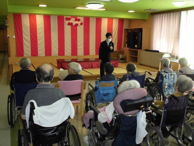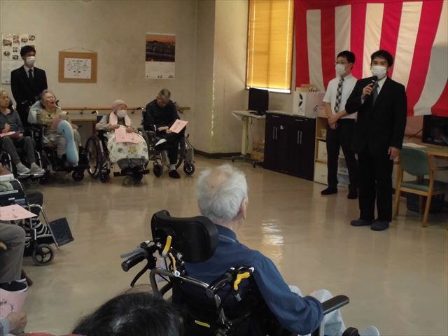 施設長から、入居者様、利用者様へ、お祝いの挨拶。