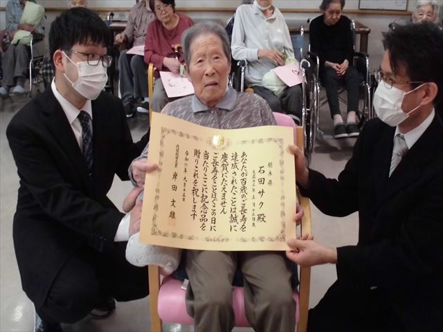 内閣総理大臣から100歳を祝う賞状と銀杯が届きました。 おめでとうございます。 入居者様は「ありがとうございます。」と大きな声で受け取られました。