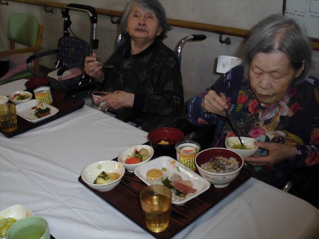この日の昼食は祝い膳。 お赤飯にお刺身、炊き合わせ、茶碗蒸し・・・とても豪華なメニューに舌鼓。 皆様「おいしいね」と、満足そうな表情で召し上がられていました。 皆様の笑顔や元気なお姿が、私たち職員の原動力になっております。 これからもお身体を大切に、笑顔が絶えない日々を過ごしましょう。
