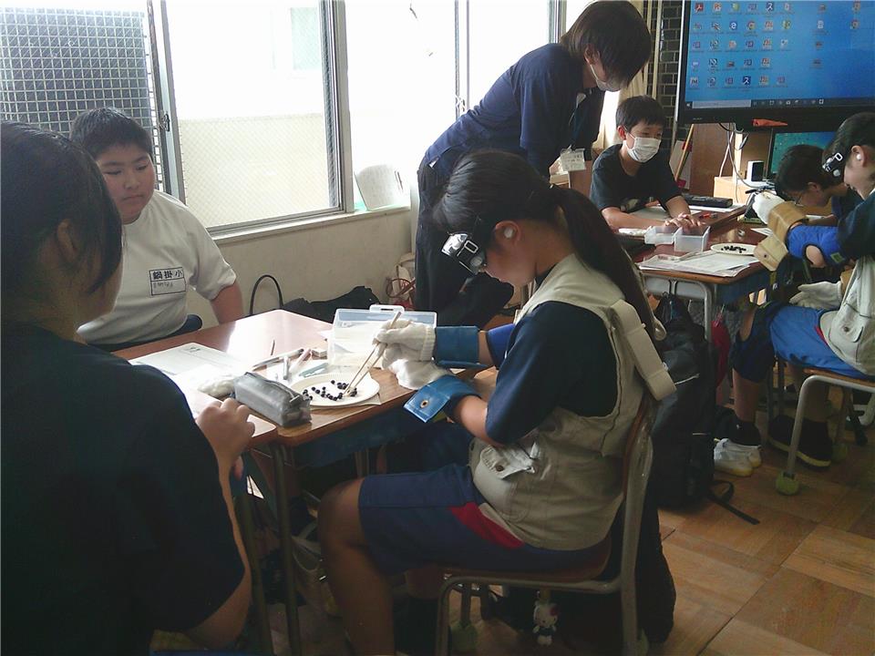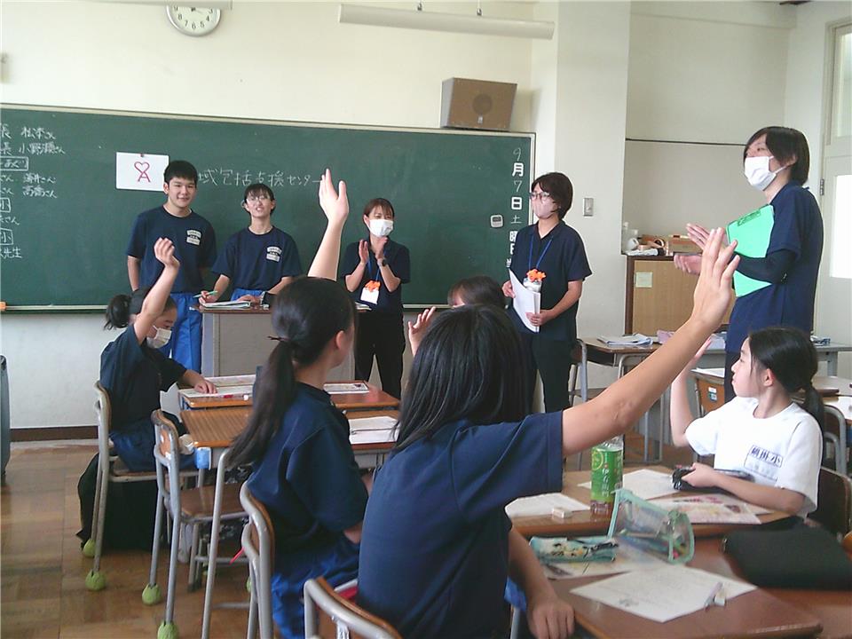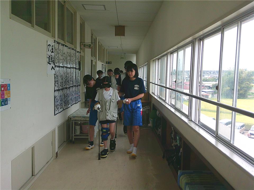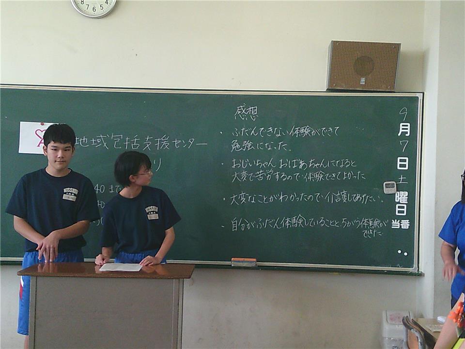 この事業は、地域に住む方や地域で活動している方々と、 日新中学校区の児童生徒が一緒に活動する取り組みです。 今回は、子どもたちにおじいちゃん・おばあちゃんの体のことを知ってもらうために、 クイズや高齢者疑似体験を行いました。