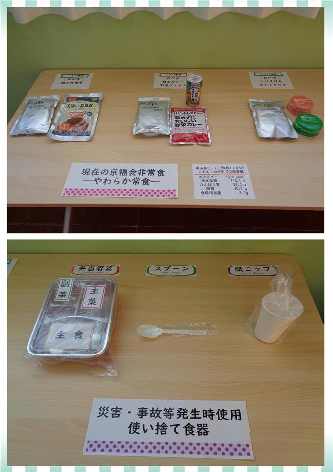 ↓↓↓現在の京福会非常食と使い捨て食器の展示をしました。↓↓↓