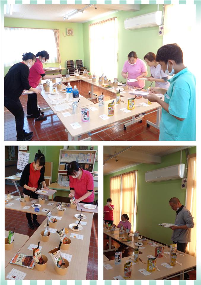 試食については、味の他にも入居者様・利用者様が食べやすいか、栄養部職員以外の職員でも提供できるのか、 そのままでも食べられるか、賞味期限、栄養量、価格などを考えながら寿山荘職員で試食をしました。