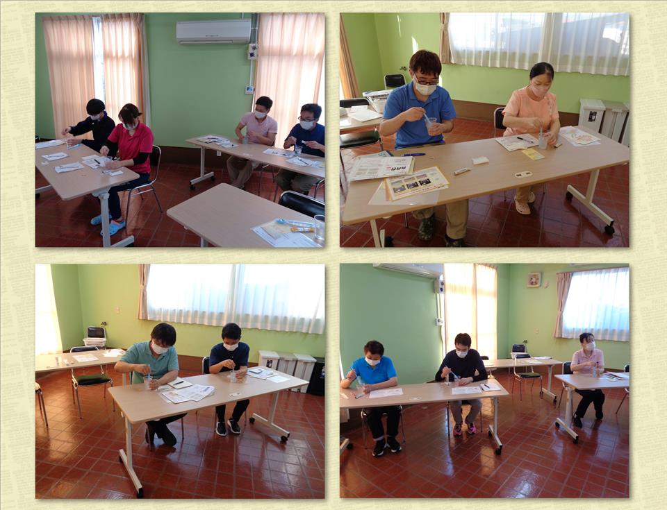 実際に「中間のとろみ」の水を作りました。 介護職員は、日々の業務の中でとろみつけの作業を行っているため ダマにならずにきれいなとろみが出来上がっていました。 その他に「薄いとろみ」「中間のとろみ」「濃いとろみ」の飲み比べをしました。 濃いとろみは「濃いね」との意見が一部ありましたが、どれも飲みやすいとの意見が多かったです。