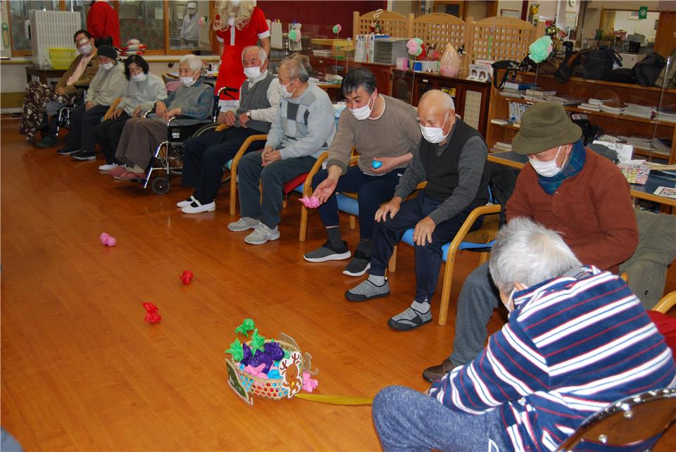 次にレクリエーションです。 そりの中にプレゼントを投げ入れて運びます。🎁 頑張れ~!📣