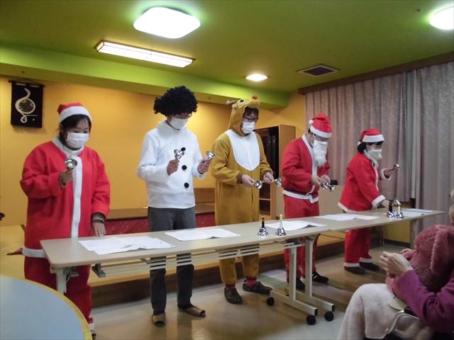 プレゼントの後は、職員によるハンドベルの演奏会です(^^♪ 真剣に演奏しました(*^-^*)綺麗な音色が奏でられたと思います(*^^*)