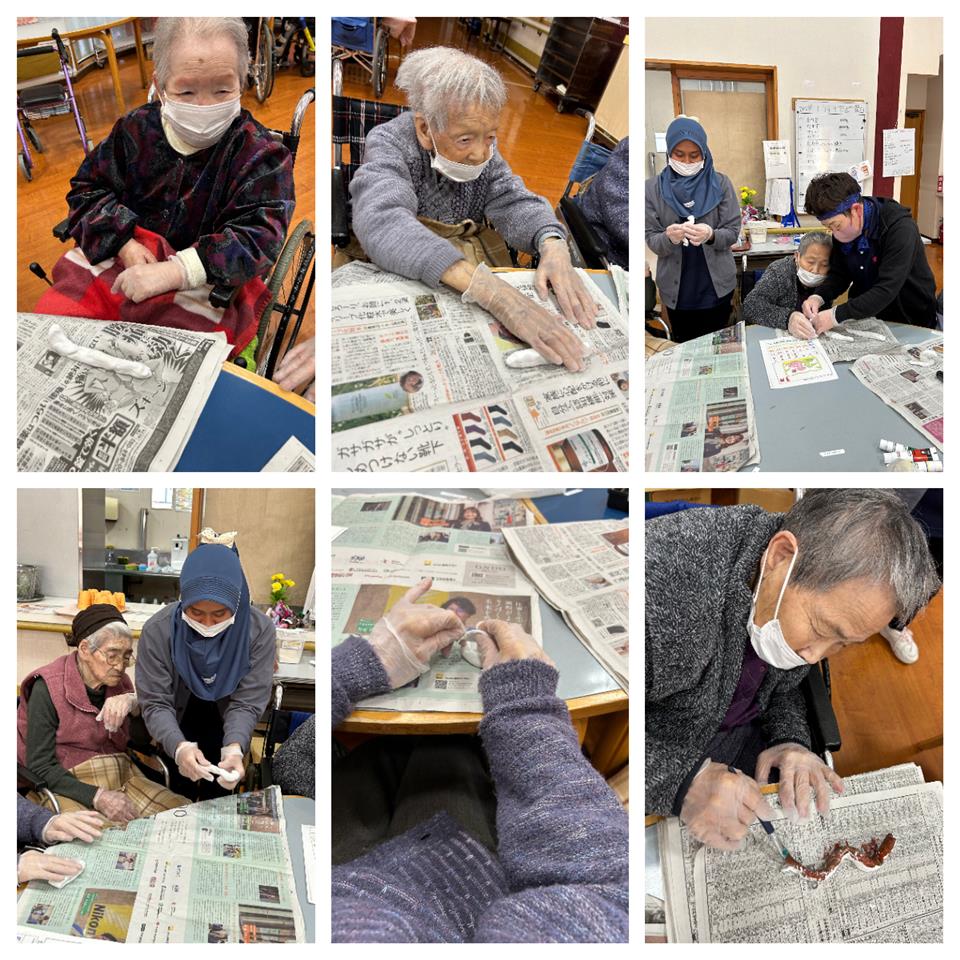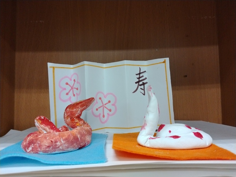 紙粘土を細く長く伸ばして形を作り色を塗っていきます みなさん一生懸命です🌠 今年の干支『巳🐍』が出来上がりました☆彡