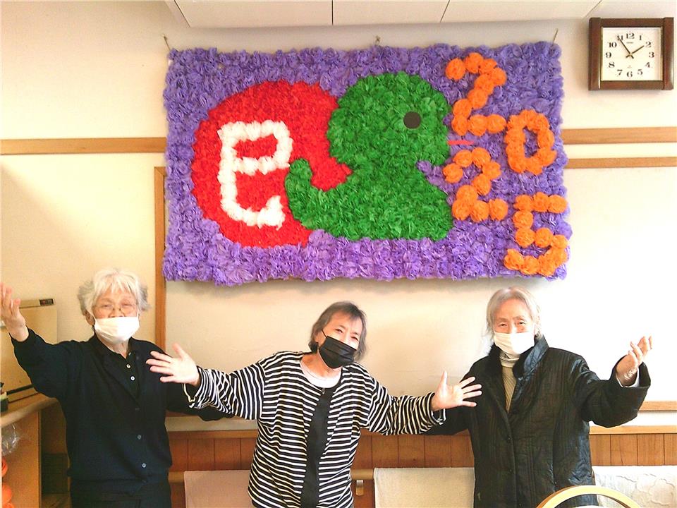 今年も、ご利用者様と職員の合作で干支のビックパネル作りました。恒例になってきましたね♪ 今年の干支は 『巳』 「蛇」に見えますかね~?(*ノωノ) 「今年もよろしくね!」のポーズ