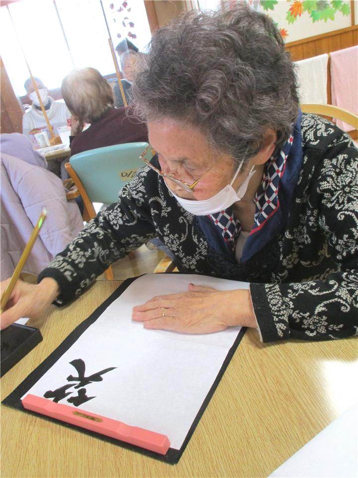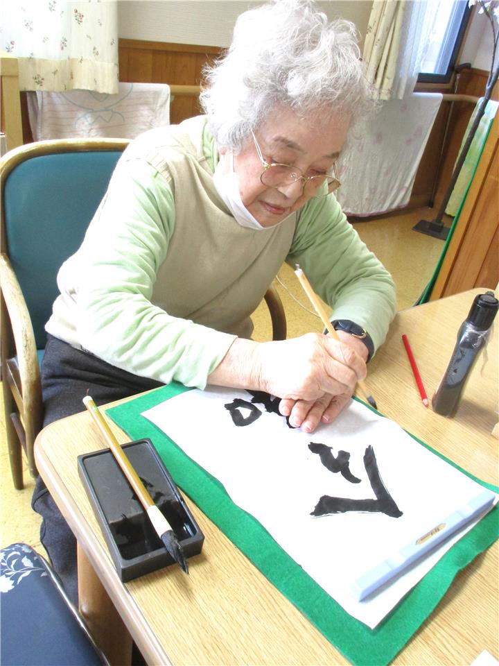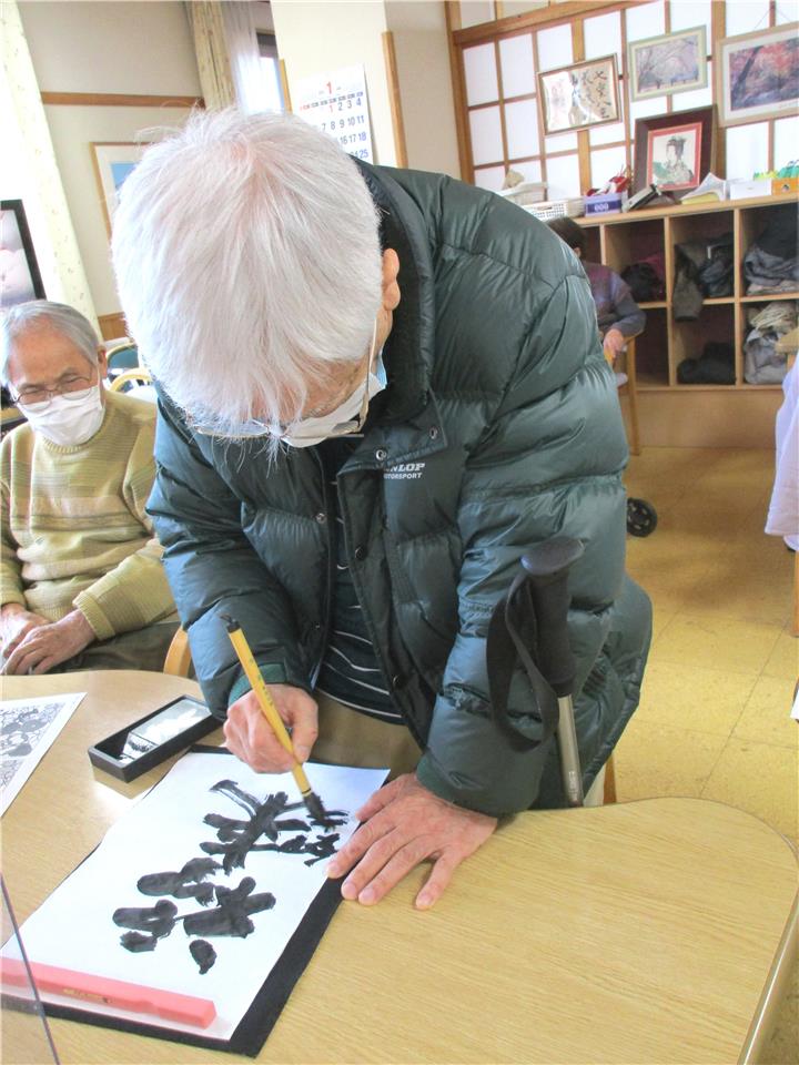 「書き初め」は、年の初めに美文字の願いを込めて書きます。皆さんは、どんな願いを込めて書くのでしょう?「何書いて良いかわからないよう~?」「自分の名前でも書くか~!」などが聞こえる中「笑う門には福来る」を書くご利用者が多かったですね~。私も、個人的に一番好きな言葉です(*^-^*)