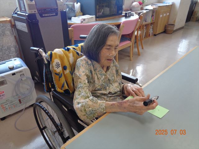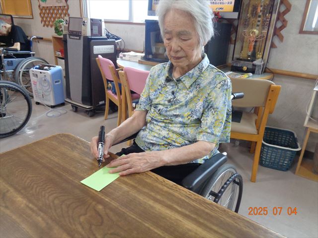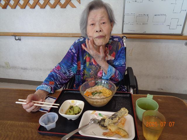 昼食は七夕にちなんだメニューが提供されました。涼し気で爽やかなメニューを堪能し、皆様「おいしいね」と喜ばれていました。 寿山荘では定期的に季節の行事を楽しんで頂いています。いつまでも元気に暮らしていけるよう、皆様の笑顔をエネルギーに日々の生活をサポートしていきたいと思います。