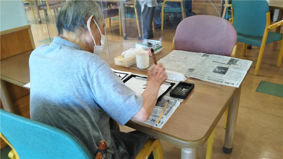 次に紹介するのは、「書道サークル」です。 今回は、「盆踊り」や「ひまわり」などの夏らしいお題でした 皆さん、筆が進んでいますね~ 真剣な眼差しで皆さん集中モードです!