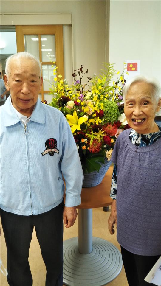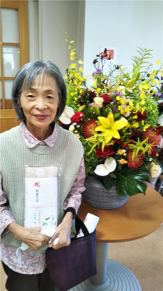 お花の前で記念撮影♪いい笑顔です(*^^*) 最後に一句 【秋晴れや 拍手の響く 敬老会】 次回もお楽しみに~