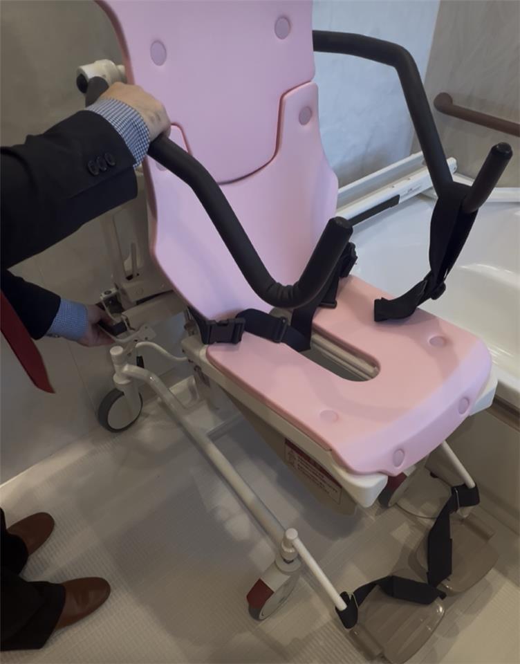 After…チルト機能(座面を傾斜させる機能)と足置きがついており、座ったまま安心して入浴できます!(^^)!