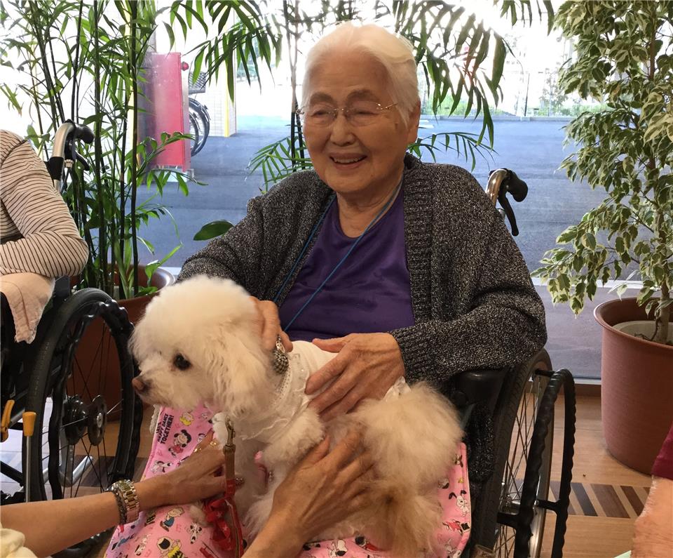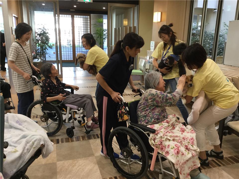 ワンちゃんたちとふれあうと、ご入居者様はたちまち笑顔になり、